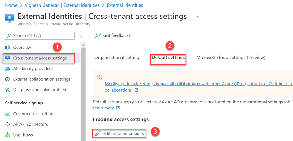 - In the left navigation, click External Identities -> Cross-tenant access settings -> Default settings-> Inbound access settings-> Edit inbound defaults.