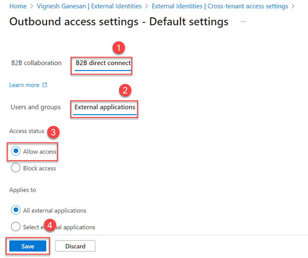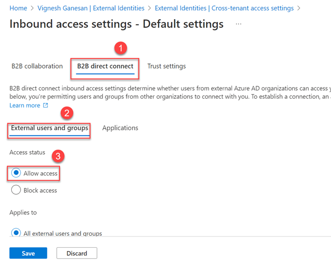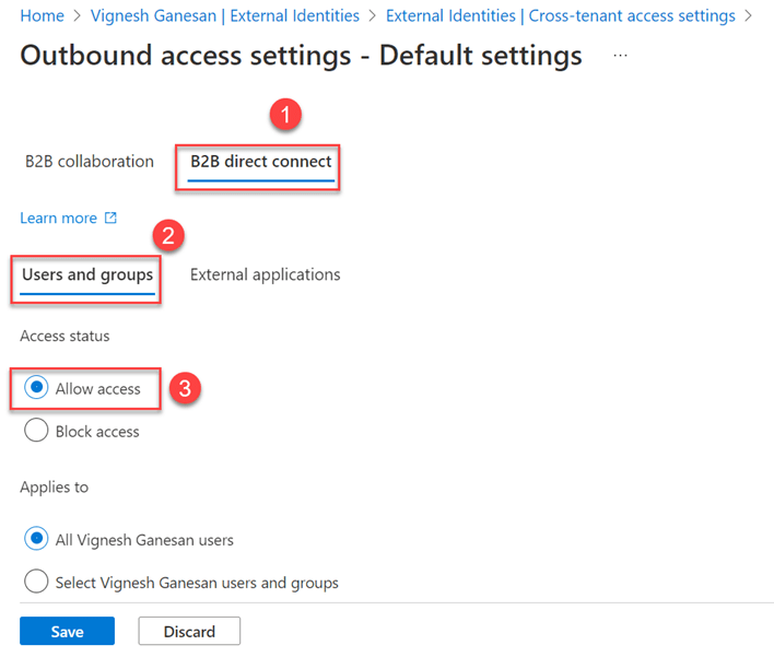 - Click B2B direct connect -> Users and groups -> select Allow access.