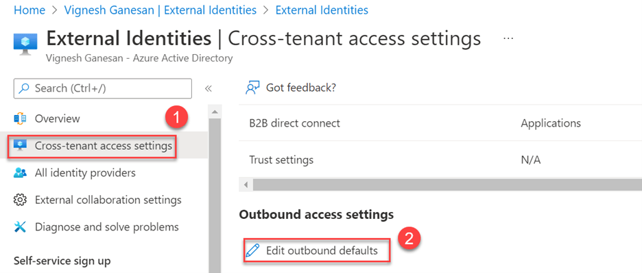- In the left navigation, click Cross-tenant access settings -> Default settings-> Outbound access settings-> Edit outbound defaults.