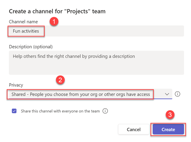 Create Shared Channels – Team owners can create shared channels for people within and outside the organization. Only people added to the shared channel can read and write messages.