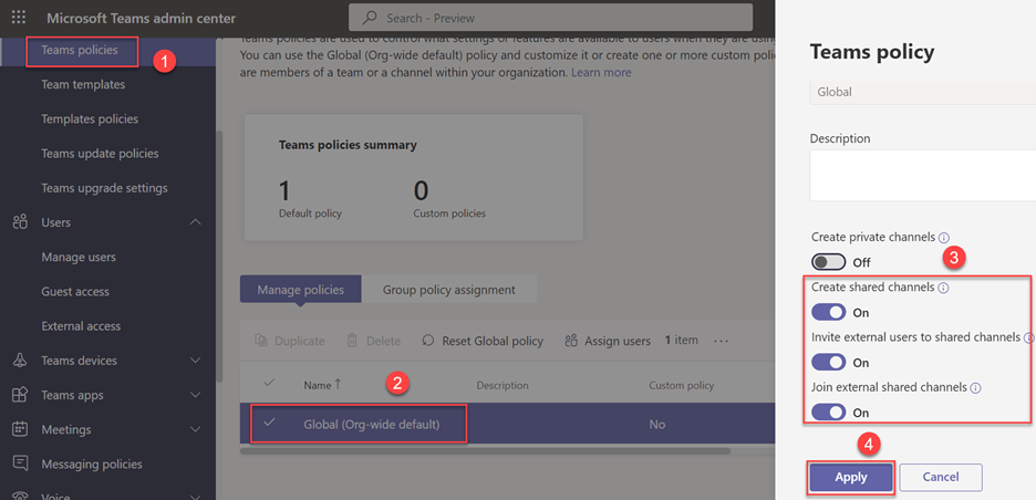- Click the Teams policy for which you want to enable shared channels, turn on the shared channels and click Apply. The following options are available as part of shared channel.