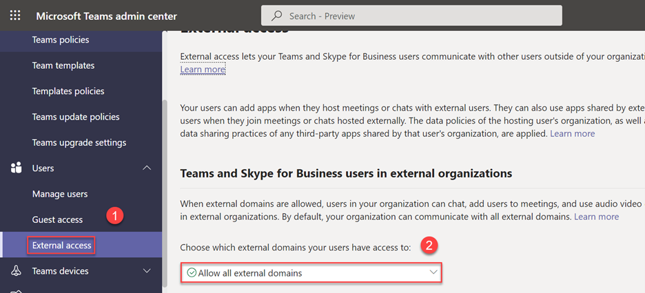 In this step, you will see how to enable external access to users so that they can participate in external meetings and to see external participants’ presence in the channel. This step needs to be performed in both the tenants (Tenant 1 & Tenant 2).