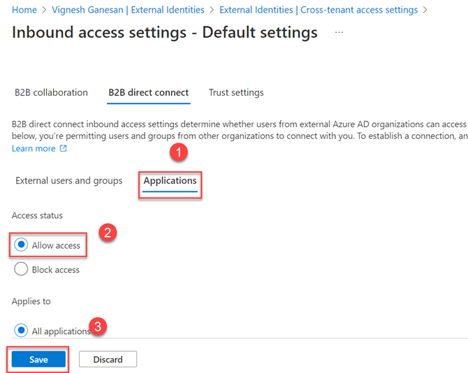 - Click B2B direct connect -> Users and groups -> select Allow access.